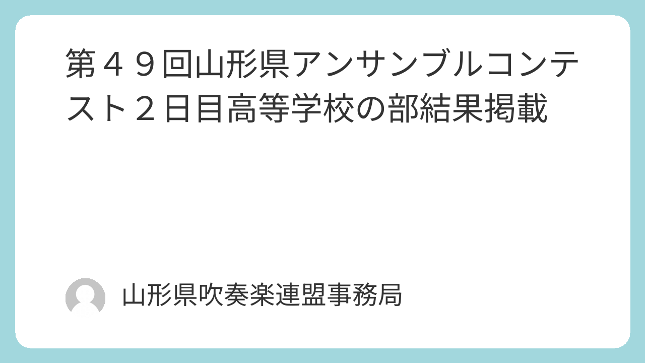 お知らせアンコン 第49回山形県アンサンブルコンテスト2日目高等学校の部結果掲載 お知らせ 2026.01.18 2026年1月18日に開催された、第49回山形県アンサンブルコンテスト2日目 高等学校の部の結果を掲載します。 高等学校の部結果